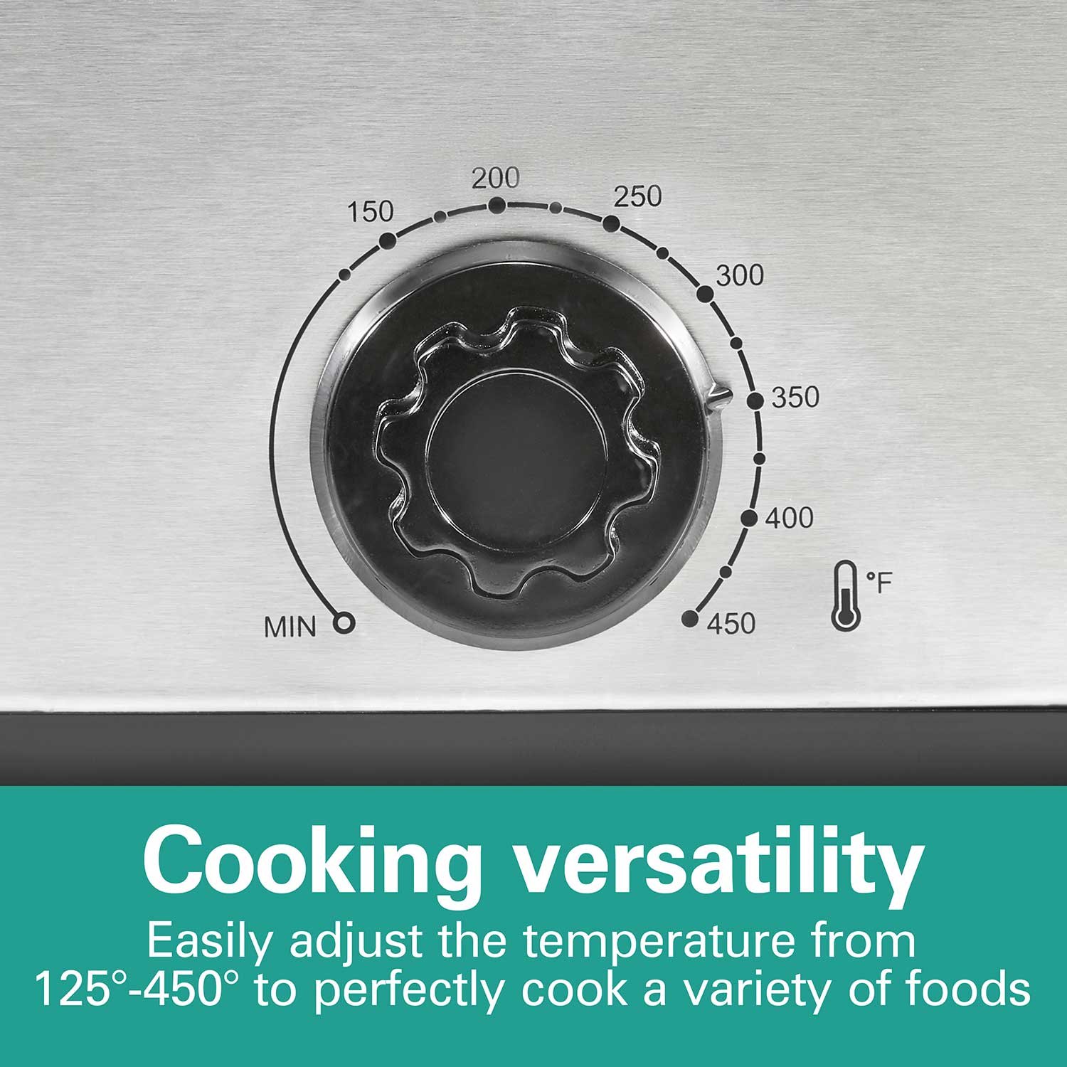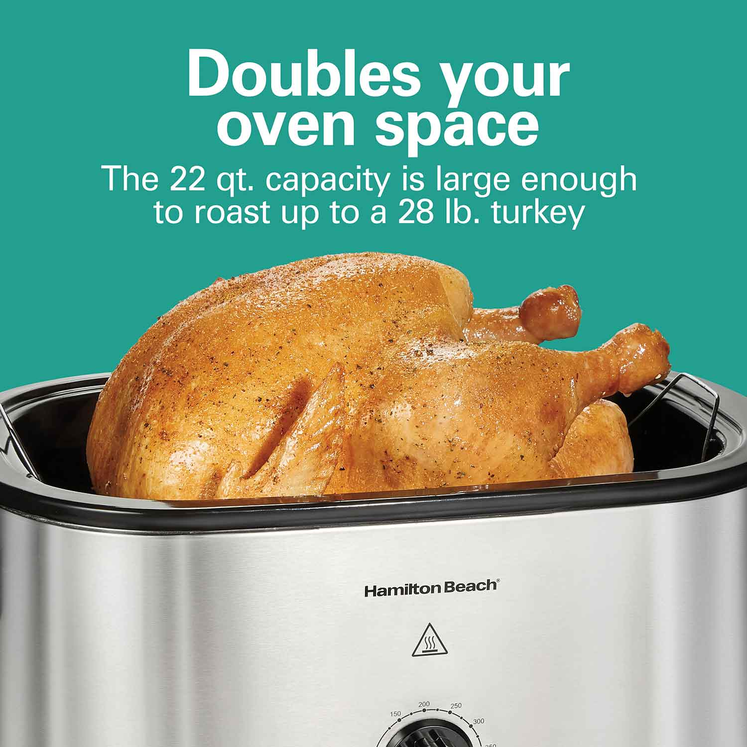 The versatile 22 quart Hamilton Beach® Electric Roaster Oven is perfect for holidays and special occasions because it easily adds extra oven space in kitchen when you need it. The roaster oven doubles your oven space and is easy to use with excellent results meal after meal. It holds a 28 lb. turkey and is great for cooking large meats, but you can also use it to steam vegetables, bake potatoes, and even to make cheesecake. This versatile roaster oven steams, slow cooks, roasts, and keeps food warm for serving guests. Easily adjust the temperature from 125 to 450° F with one simple knob, to perfectly cook a variety of foods. You'll love the convenience of preparing your favorite foods in one pan, in a roaster that's simple and intuitive to use. The removable cooking pan conveniently lifts out for easy cleaning too. And the included lift-out rack makes it easy to lift large meats, like baked ham and roasted turkey, from the roaster oven. The large capacity of the roaster oven makes it perfect for entertaining, whether you're feeding friends and family or hosting a special event.