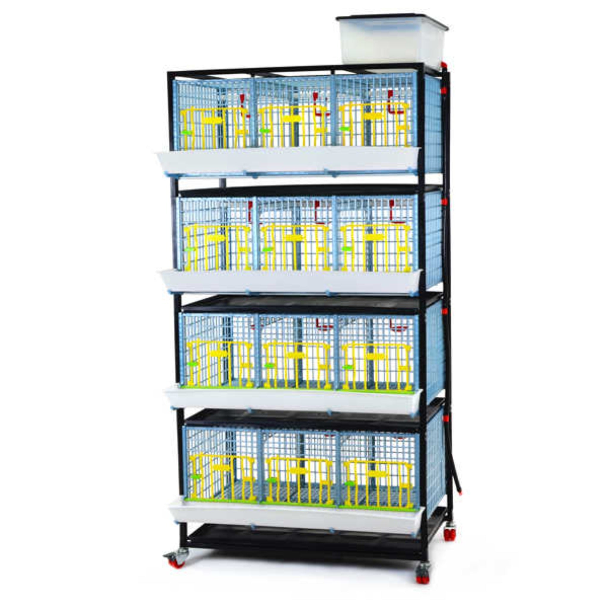 Power-washable & rust-proof stacking grow out pen is perfect for rearing pullets (chickens), quail, pheasants, partridge, ducklings, goslings, teen turkeys, or game birds. With 15" of headspace, this unit will ensure your birds grow up safely before joining the flock. To prevent bird wetting, closed nipple drinkers receive clean, algae-free water from the water tank above. To prevent foot problems, the flooring is slightly larger than the brooder yet smaller than adult pens. The unit boasts lockable wheels and an improved door locking system to prevent escapees. To remove waste efficiently, there are deep manure trays. Red feed grill covers are included to eliminate the flinging of feed, thus saving money.