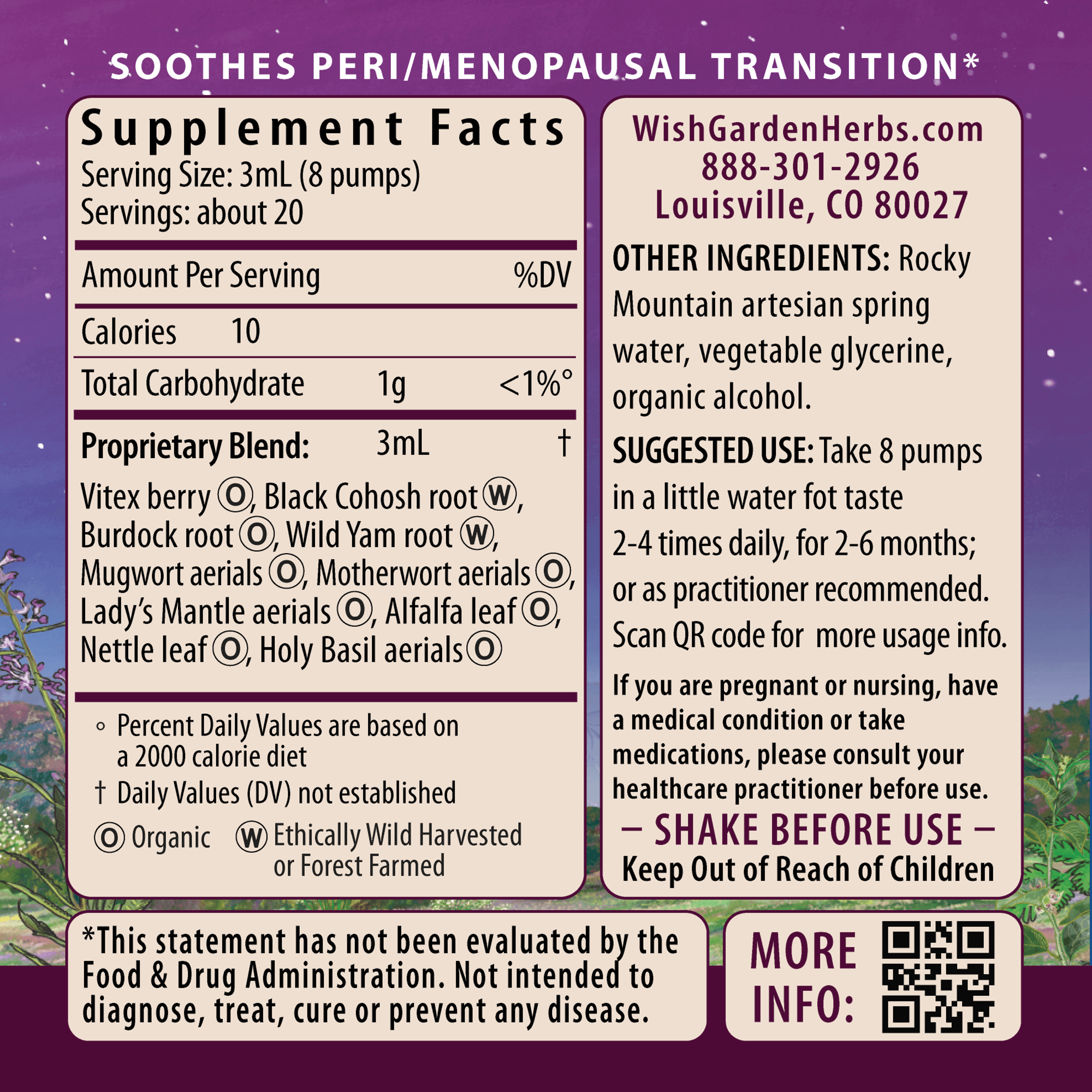 Organic Vitex berry (Vitex agnus-castus), Black Cohosh root (Actaea racemosa (syn. Cimicifuga racemosa)), organic Burdock root (Arctium lappa), Wild Yam root (Dioscorea villosa), organic Mugwort aerials (Artemisia vulgaris), organic Motherwort aerials (Leonurus cardiaca), organic Lady's Mantle aerials (Alchemilla vulgaris, A. xanthochlora), organic Alfalfa leaf (Medicago sativa), organic Nettle leaf (Urtica dioica), organic Holy Basil (Tulsi) aerials (Ocimum spp.), Rocky Mountain artesian spring water, vegetable glycerine & organic gluten-free alcohol.
