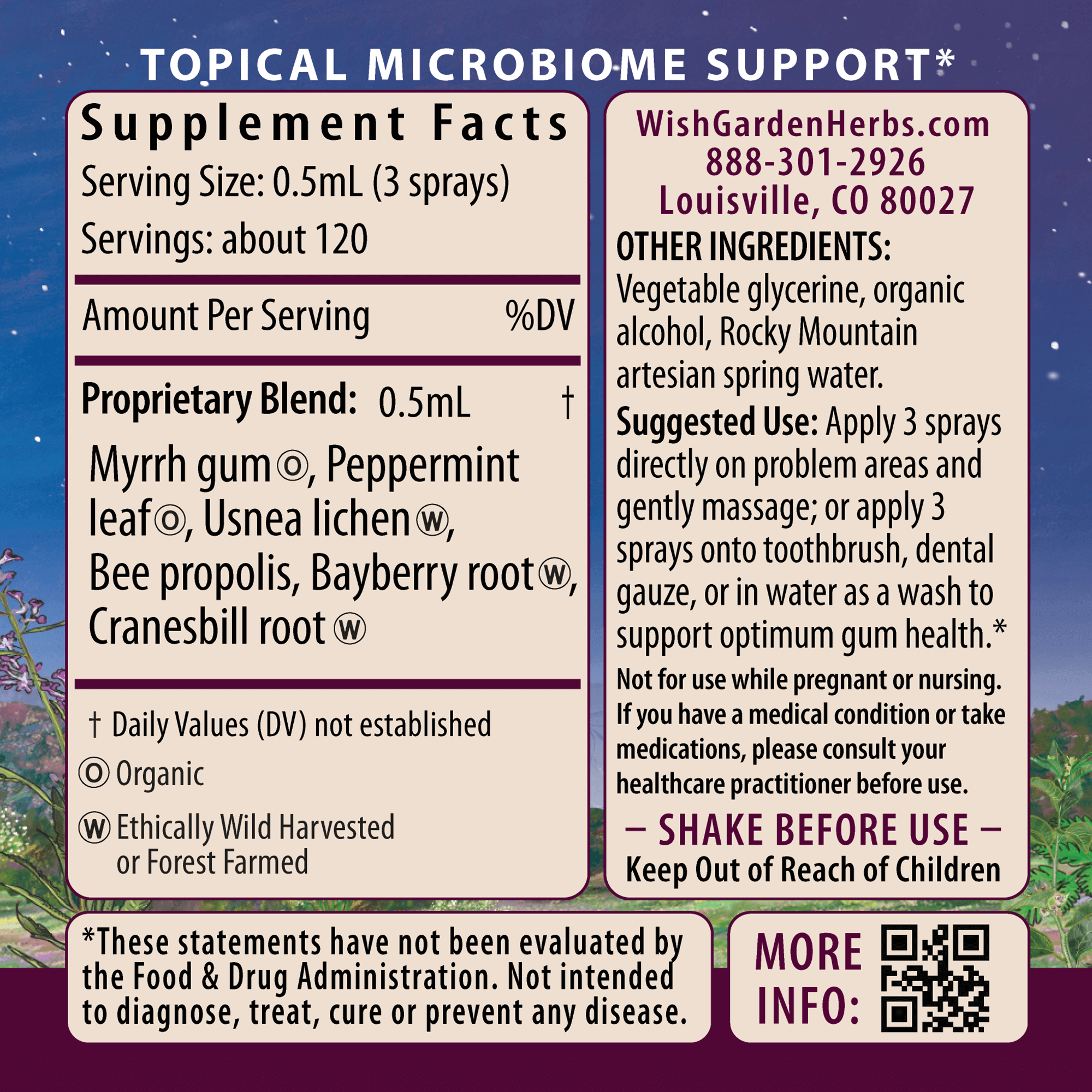 Organic Myrrh gum (Commiphora molmol, C. myrrha), organic Peppermint leaf (Mentha piperita), Usnea lichen (Usnea spp.), Bee Propolis, Bayberry rootbark (Morella cerifera), Cranesbill root (Geranium maculatum), organic gluten-free alcohol, vegetable glycerine & Rocky Mountain artesian spring water.