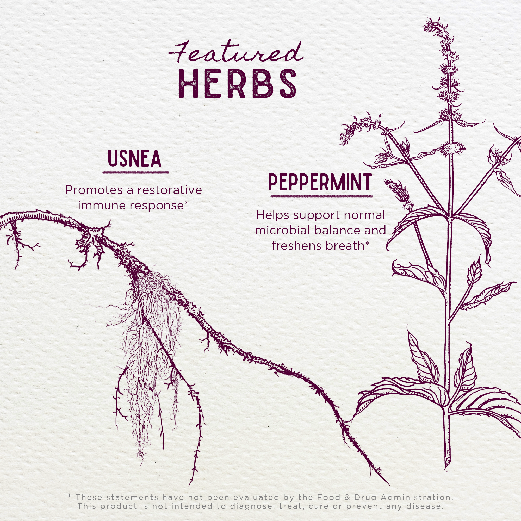 • Peppermint leaf: Mentha piperita helps support healthy microbial balance, ease clogged sinuses and freshen breath.