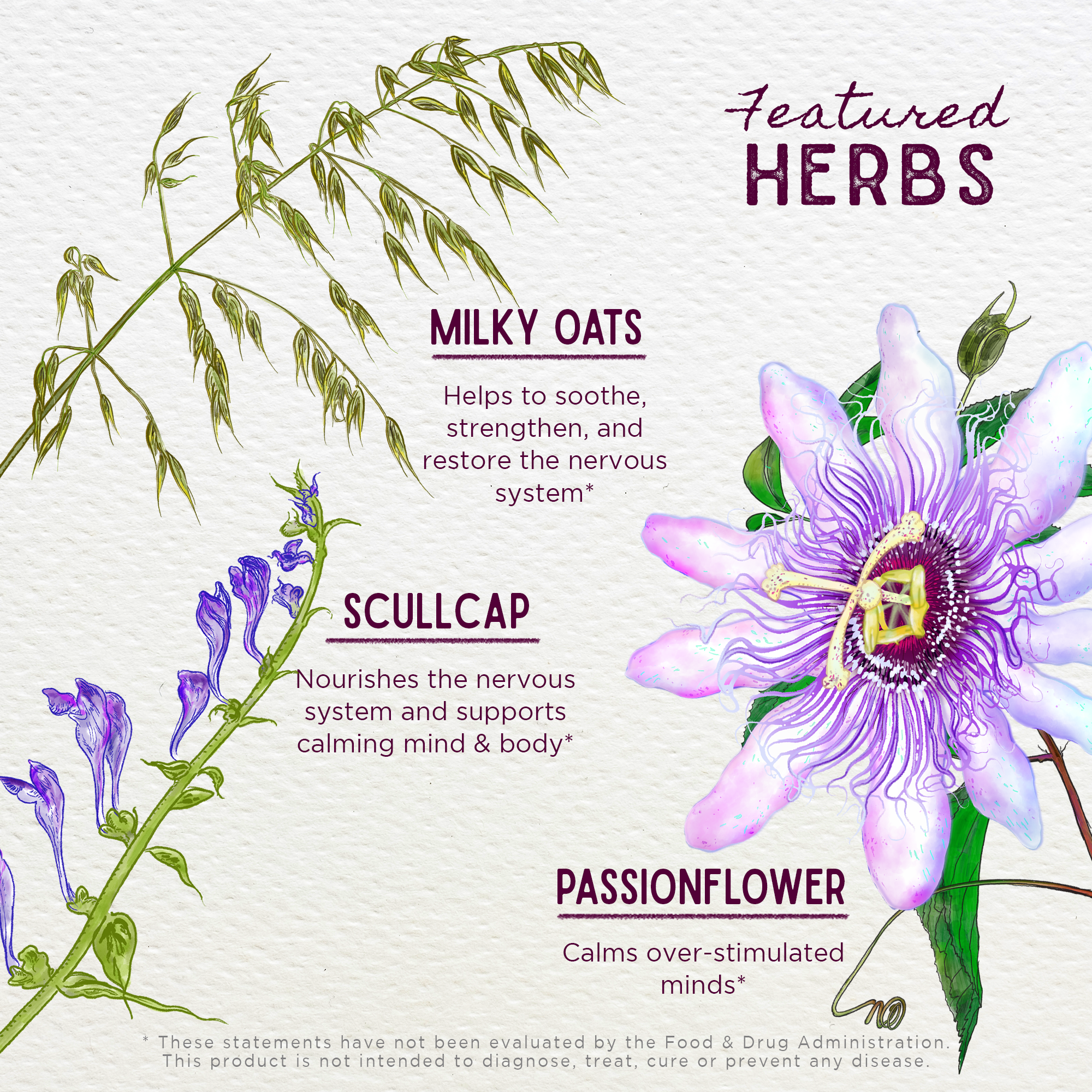 Organic Passionflower aerials (Passiflora incarnata), organic Milky Oat tops (Avena sativa), organic Scullcap aerials (Scutellaria lateriflora), Rocky Mountain artesian spring water, vegetable glycerine & organic gluten-free alcohol.