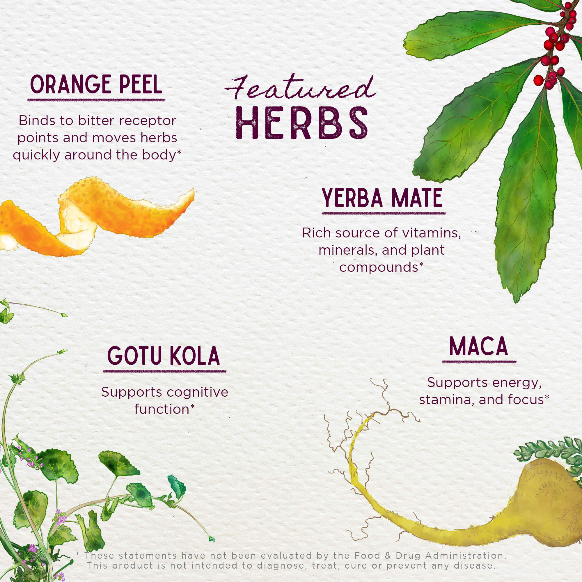 • Yerba Mate leaf: Ilex paraguariensis awakens the mind like coffee, but without the jittery side effects. It boosts mood and energy, supports mental focus and physical performance.